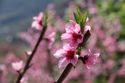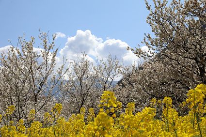 在瀘定縣冷磧鎮(zhèn)、德威鎮(zhèn)等地,桃花、油菜花及櫻花競(jìng)相開放,一團(tuán)團(tuán)、一簇簇,綴滿枝頭,藍(lán)天、白云與各色花兒相交,金黃花海在微風(fēng)中起伏。一畦畦油菜花田錯(cuò)落有致、層次分明,綿延不斷?!岸聶鸦ㄩ_,三月桃花盛,四月紅櫻桃,五月水蜜桃?!背擞筒嘶ǎ磕觋?yáng)春三月,瀘定的桃花也隨著和煦春風(fēng)落滿枝頭滿樹的花芽沁著香氣,一點(diǎn)點(diǎn)溢到空氣中,香了春風(fēng),也香了整座城。