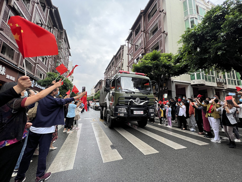 在磨西鎮(zhèn)大坪安置點,受災(zāi)群眾送別救援隊伍。 張建國 攝