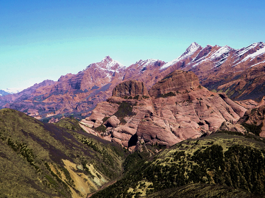 到了新龍縣,從新龍縣銀多鄉(xiāng)向北遠(yuǎn)望,你就會看到迄今為止青藏高原上發(fā)現(xiàn)的海拔最高、區(qū)域最廣的丹霞地貌。綿延三十多公里的紅色,在烈日照耀下閃耀著刺目的光,與周圍墨綠色的山體形成鮮明的對比。