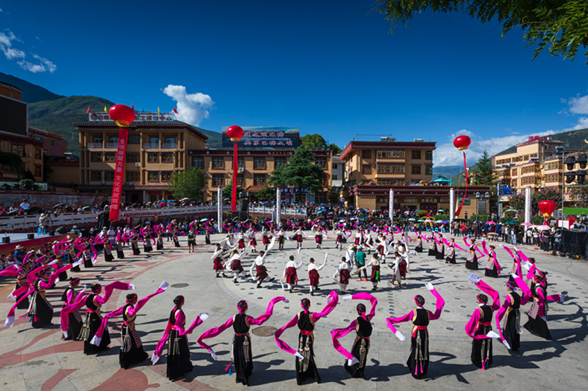 金弦子廣場,舞者們仿若守護(hù)者一般,圍著金黃色的弦子雕塑,或輕歌曼舞或昂揚(yáng)踏步,斑斕的畢旺、搖曳的流蘇和飄逸的紅袖與花共舞,與景相映,聲聲吟唱、步步踏尋,是追憶更是誓言。