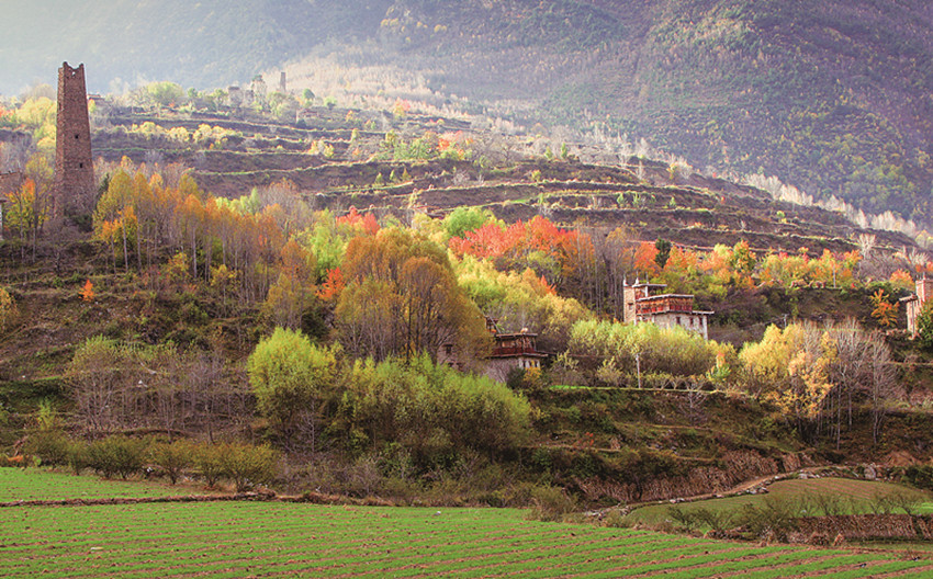 四季更迭,中路藏寨的魅力各異。秋天,正是藏寨最為絢爛的季節(jié)。造型獨特、別致的藏式民居,蜿蜒曲折的林間小道,組成了一幅美不勝收的畫卷。藏寨依山勢迤邐連綿,分布在相對高差近千米的山坡上,藏式樓房灑落在五彩斑斕的彩林中,與山谷、溪流、雪峰交相輝映,極富層次,構(gòu)成了一幅恬靜如詩的優(yōu)美畫卷。