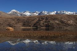 雪山倒映在卡薩湖中(11月9日攝)??ㄋ_湖位于四川省甘孜藏族自治州爐霍縣西60公里處,海拔3510米、面積1.92平方公里,屬于高原淡水湖泊,是川藏北線最大的水鳥棲息地。冬季的卡薩湖,湖水如鏡,倒映著群山白云,恬靜美麗。新華社記者 江宏景 攝