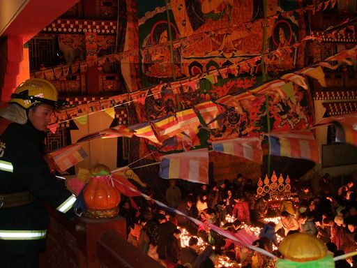 康定的幾座黃教寺廟舉行了法會(huì),擺酥油花,燃元根燈供佛。信教群眾除在家供燈外,有的還登跑馬山,赴南無(wú)寺敬燈油。入夜后又成群結(jié)隊(duì)涌向康定城中的安覺(jué)寺,參加元根燈會(huì),以此紀(jì)念藏傳佛教格魯派創(chuàng)始人、宗喀巴大師圓寂成佛。安覺(jué)寺里人潮涌動(dòng),熱鬧非凡。有扶老攜幼的信教群眾,有祈求平安的生意人,也有慕名而來(lái)的外地?cái)z影師。燈會(huì)這天,最忙碌的除了寺廟里的喇嘛,就數(shù)在寺廟周圍站崗的消防員了,消防員李剛說(shuō):“一大早就有遠(yuǎn)道而來(lái)的信教群眾和僧尼到寺廟里點(diǎn)燈了,為了保障寺廟的消防安全,我們已經(jīng)在這飄著雪花的冬日里站了整整一天了,要等到每一盞燈都安全的燃盡,我們才可收隊(duì)離開(kāi)。”