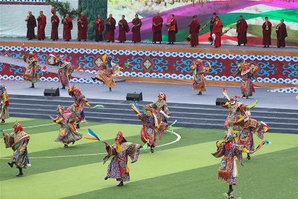 7月29日,來自四川省道孚縣各地的上萬名藏族群眾在道孚中學載歌載舞,歡慶第三屆安巴農(nóng)耕文化旅游節(jié)。安巴在藏語中是五月的意思,藏歷五月正值農(nóng)閑時期,藏族群眾都會舉行各種活動,祈禱風調(diào)雨順,吉祥平安。