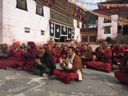 當(dāng)宣講組一行來到郭沙寺時(shí),寺廟僧人們早已迫不及待的等候在寺廟外?!奥犝f你們今天要來,我們?nèi)律舷露己芨吲d、很期待?!彼聫R堪布甲它激動(dòng)地說。