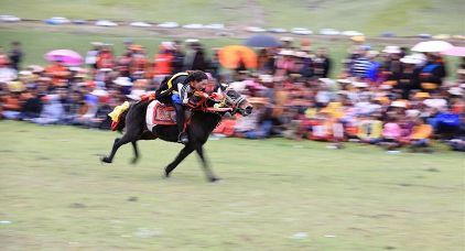 7月23日,四川甘孜藏族自治州理塘縣村戈鄉(xiāng)賽馬活動(dòng)開(kāi)始,牧民們?cè)隈R背上一顯身手。每年藏歷六月,當(dāng)草原上格?;ㄊ㈤_(kāi)的時(shí)候,四川省理塘縣24個(gè)鄉(xiāng)(鎮(zhèn))就會(huì)按照習(xí)俗舉辦隆重的賽馬會(huì)來(lái)拜祭神山,慶祝豐收。迄今有400多年歷史的賽馬分為耐力賽、小走賽、馬術(shù)賽等,其中最為精彩的是馬術(shù)賽:馬肚藏身、馬背倒立、飛騎射擊、拾哈達(dá)等,驚險(xiǎn)刺激。2008年6月,此項(xiàng)活動(dòng)被列入四川省級(jí)非物質(zhì)文化遺產(chǎn)保護(hù)項(xiàng)目。(朱虹 葉強(qiáng)平)