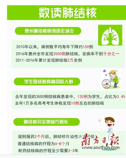 據(jù)惠州市結(jié)防所相關負責人介紹,惠州市近年(2011—2016年)發(fā)現(xiàn)肺結(jié)核病例2萬余例,絕大部分患者都能治愈,治愈率達到90%以上。2010年的一項流行病學調(diào)查顯示,惠州市結(jié)核病發(fā)病率為千分之二,目前這一數(shù)字已降至不到千分之一?!叭ツ臧l(fā)現(xiàn)3500例,發(fā)病率略低于全省平均水平,并且發(fā)病趨勢近年來逐年下降,2010年以來,病例數(shù)平均每年下降約150例。”劉志東表示,這跟防控工作的成效以及人們防護意識的提高密不可分。然而,目前結(jié)核病的防治仍然面臨嚴峻的形勢:一是發(fā)病人數(shù)多;二是耐藥結(jié)核病流行;三是學校存在發(fā)生結(jié)核病疫情的潛在風險。
