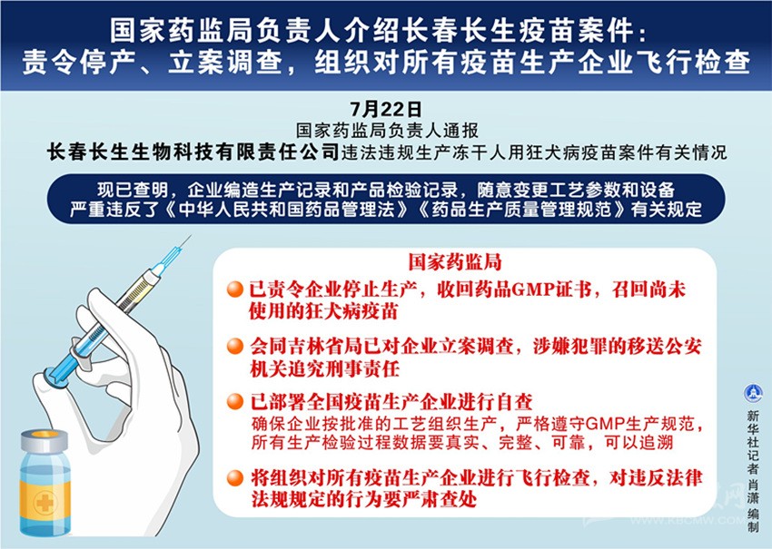 國(guó)家藥監(jiān)局負(fù)責(zé)人22日通報(bào)長(zhǎng)春長(zhǎng)生生物科技有限責(zé)任公司違法違規(guī)生產(chǎn)凍干人用狂犬病疫苗案件有關(guān)情況。這位負(fù)責(zé)人說(shuō),國(guó)家藥監(jiān)局已責(zé)令企業(yè)停止生產(chǎn),收回藥品GMP證書(shū),同時(shí)會(huì)同吉林省局已對(duì)企業(yè)立案調(diào)查,涉嫌犯罪的移送公安機(jī)關(guān)追究刑事責(zé)任。國(guó)家藥監(jiān)局將組織對(duì)所有疫苗生產(chǎn)企業(yè)進(jìn)行飛行檢查,對(duì)違反法律法規(guī)規(guī)定的行為要嚴(yán)肅查處。 這位負(fù)責(zé)人說(shuō),根據(jù)舉報(bào)提供的線(xiàn)索,7月5日,國(guó)家藥監(jiān)局會(huì)同吉林省局對(duì)長(zhǎng)春長(zhǎng)生公司進(jìn)行飛行檢查;7月15日,國(guó)家藥監(jiān)局會(huì)同吉林省局組成調(diào)查組進(jìn)駐企業(yè)全面開(kāi)展調(diào)查。7月15日,國(guó)家藥監(jiān)局發(fā)布了《關(guān)于長(zhǎng)春長(zhǎng)生生物科技有限責(zé)任公司違法違規(guī)生產(chǎn)凍干人用狂犬病疫苗的通告》。
