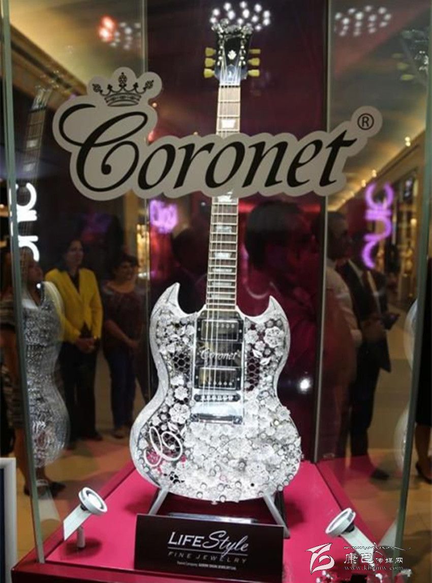 這件鉆石吉他由中國(guó)香港著名音樂人雷頌德設(shè)計(jì),周大福珠寶公司與吉布森吉他公司合作出品,用400克拉鉆石和1.6公斤黃金鑲嵌打造而成,總價(jià)值達(dá)200萬美元(約合1300萬元人民幣)。