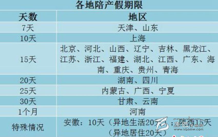 目前,陪產(chǎn)假最短的為天津、山東兩地,為7天;其次是上海,為10天。北京、河北、山西、遼寧、吉林、黑龍江、江蘇、浙江、福建、湖北、江西、廣東、海南、重慶、貴州、青海等省份的陪產(chǎn)假都為15天。