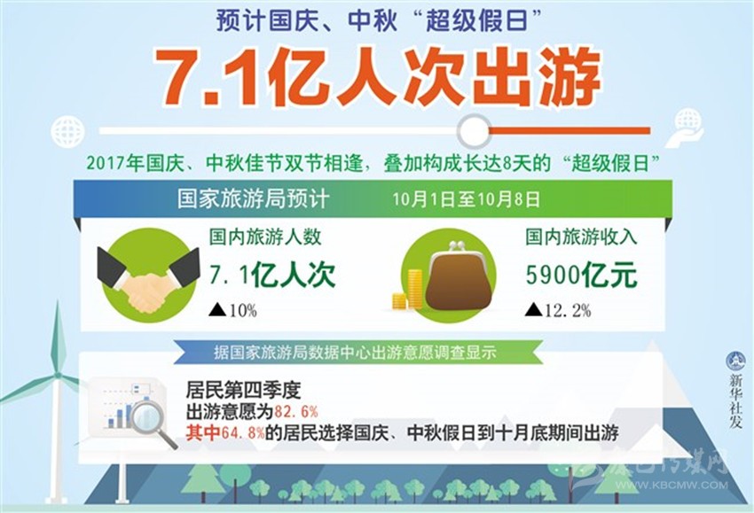 今年國慶、中秋佳節(jié)雙節(jié)相逢,疊加構(gòu)成長達8天的“超級假日”。國家旅游局預計,10月1日至8日國內(nèi)旅游人數(shù)將達到7.1億人次,國內(nèi)旅游收入將達到5900億元,較去年同期分別增長10%和12.2%。