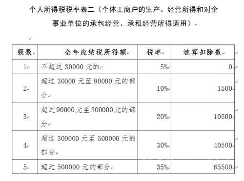 個(gè)人所得稅稅率表二(個(gè)體工商戶(hù)的生產(chǎn)、經(jīng)營(yíng)所得和對(duì)企事業(yè)單位的承包經(jīng)營(yíng)、承租經(jīng)營(yíng)所得適用)