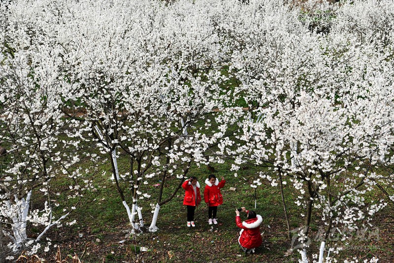 游客在貴州省黔西縣新仁苗族鄉(xiāng)化屋村的櫻桃樹下留影(2月19日攝)。