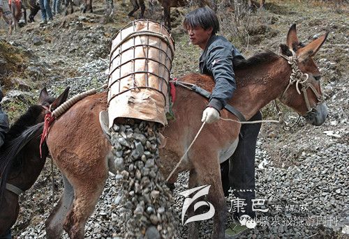 每天早上6點多,王玉海和同伴趕著騾子隊,從白玉縣縣城旁邊的住地步行約1小時到達德沙村,約8開始從離索道橋約300米的路邊沙石場裝運碎石。他們通常工作到下午5點,每只騾子在海拔3000米左右的高度,來回運送20次左右,每只騾子運輸碎石大約在3000公斤左右。這些騾子正當強壯年,年齡大約在三四歲,通常在坡度在30度以下的,最大負重約800斤。