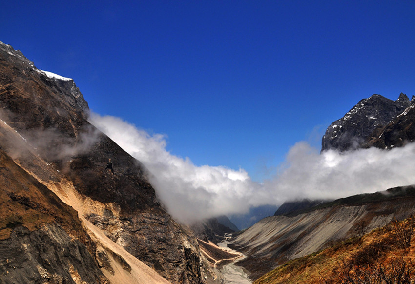 第二天,我們準備游玩燕子溝,醒來的第一件事就是拉開窗簾看看天氣,又一陣興奮,天氣依然非常晴朗,今天是進燕子溝的第一天,我早做足了準備,太陽帽、墨鏡、食品等等一樣不少。從磨西到燕子溝溝口的路程很長,需要坐景區(qū)的觀光車,因為天氣的原因,山上只有少些云霧繚繞,環(huán)在山腰,仿佛是一幅山水畫景。我們先來到了冰窖口,這里的海拔有三千多米,所幸大家都沒有高原反應,后坐車下山,來到有“定海神針”之稱的一棵高大筆直的杉樹。這棵杉樹皮粗厚,已經(jīng)沒有了樹葉,樹枝也寥寥無幾,更顯滄桑。站在樹下遙望,顯得人是那么渺小。不禁讓人遐想這顆千年古樹的滄桑歷史。然后開始步行游玩,這里海拔比較低,走 起來不是很累,在城市中見慣了高樓大廈,車水馬龍的我們,此刻真有一種離開凡塵,來到世外桃源的感覺,我們一路依山而上,越走越高。我們終于來到了天藥水坪,這里的景色已經(jīng)完全不同于山下,看著遠處的山,我們都不約而同地“哇”了一聲。