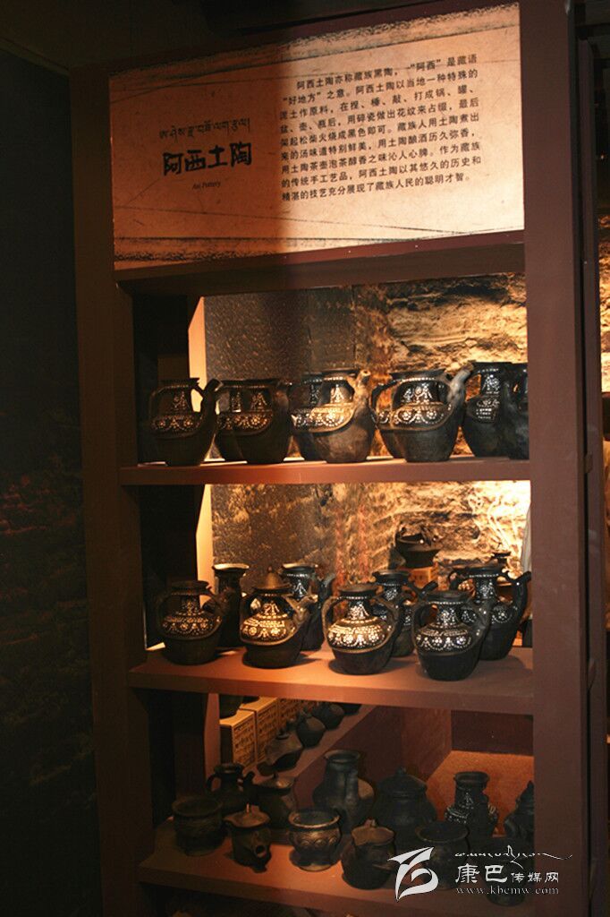 阿西土陶是藏家傳統(tǒng)土法制作的手工藝品,又稱藏族黑陶,因其燒制后呈黑色而得名。阿西土陶以當(dāng)?shù)匾环N特殊的泥土為原料,加上其他兩種泥土混合而成,制作中不斷地捏、錘、敲、打,使之成型,還要用碎瓷做出花紋來點(diǎn)綴,最后架起松柴點(diǎn)火燒,在燒紅的土陶上灑上麥糠就呈現(xiàn)出黑色了。阿西土陶主要表現(xiàn)為陶鍋、陶罐、陶盆、陶壺、陶瓶等形式。最初,當(dāng)?shù)厝艘蕴斟伒葥Q取其它地方的糧食或其它物品,現(xiàn)今的阿西土陶則已經(jīng)走向市場(chǎng),更多地作為旅游商品和本地人的家庭裝飾品。
