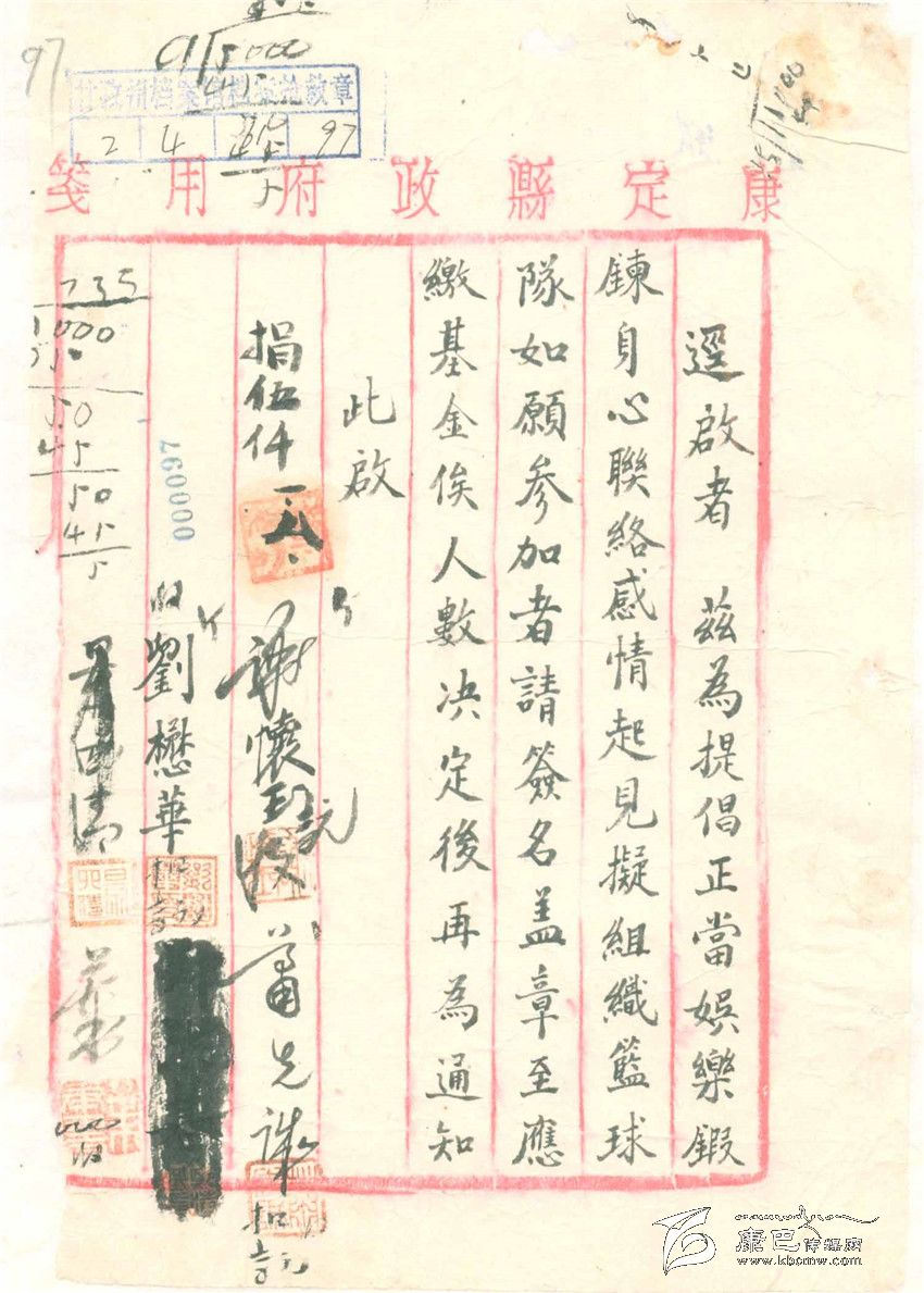 這是一張用解放前的康定縣政府便箋寫的“啟事”,內容是倡議成立一支籃球隊。在上面簽字的有十多個人,這十多人一定是籃球運動的愛好者。至于這支籃球隊后來是不是成立等等都不見下文。而且,從這張“啟事”上看不到這件事發(fā)生在哪一年,只有一位名叫李培清的人寫下了收到捐款5700元、“三月三十日”的日期。最有意思的就是,在這張“啟事”上記下了的這句話:縣長捐購籃球款伍仟元。這句話起碼包涵了以下的意思,一,康定城里已經興起了籃球運動;二,成立籃球隊沒有專門的經費,幸好人們有很高的積極性,連縣長也主動捐款,那些簽名后面隱約可見的數字也可能是捐款的數字。