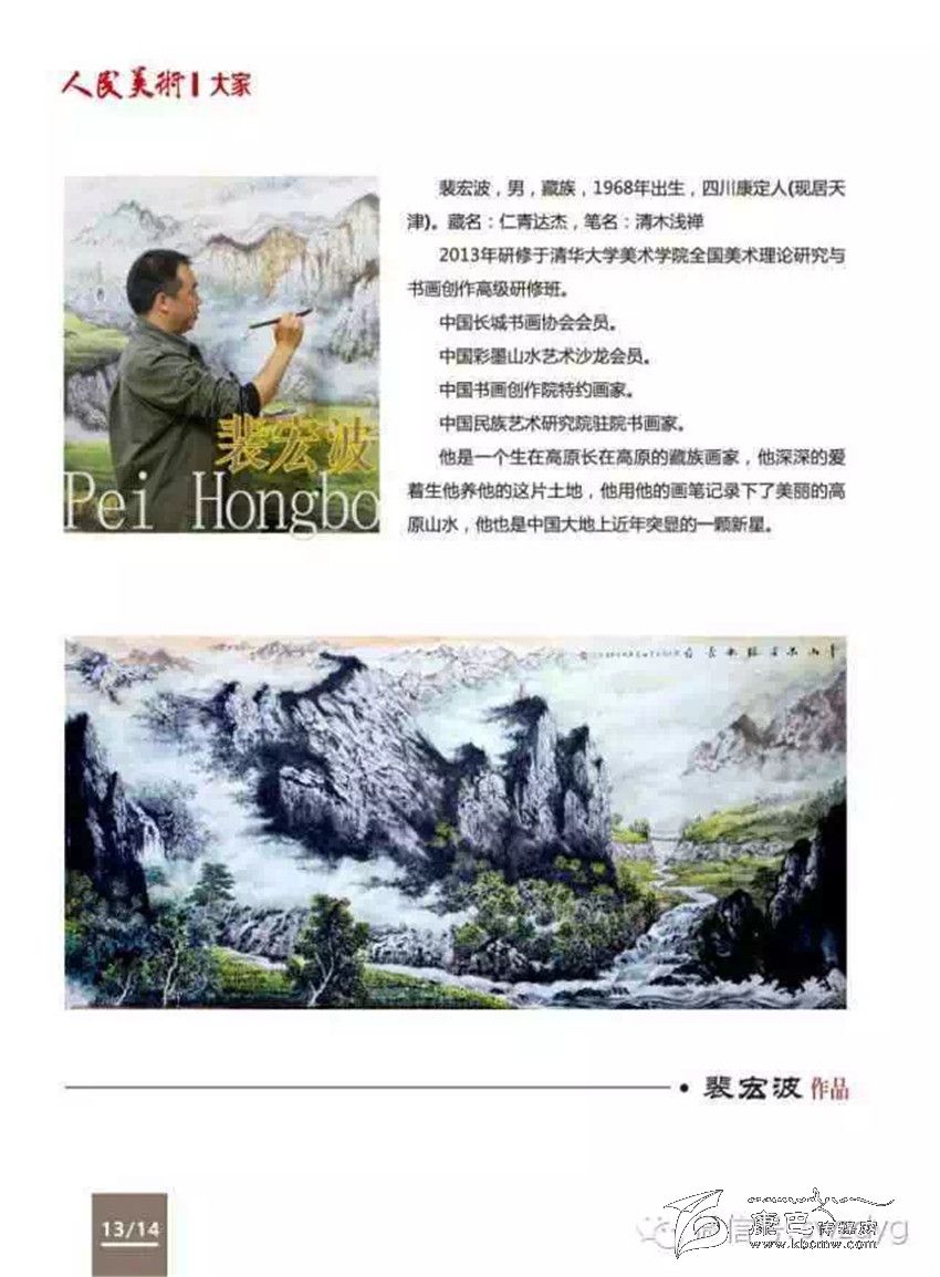 《人民美術(shù)》是中國最具權(quán)威的美術(shù)雜志、國家核心美術(shù)雜志和美術(shù)界最高學(xué)術(shù)雜志,由《人民日報》社主管。雜志社對裴宏波及其作品給予了高度評價,認(rèn)為藏族畫家裴宏波的作品極具生命力,在中國美術(shù)史上又有了新的突破,富有民族性、地域性、創(chuàng)造性、歷史性,最終決定列選為中國大家。雜志中裴宏波排在劉大為、曹雕、劉文西等之后。