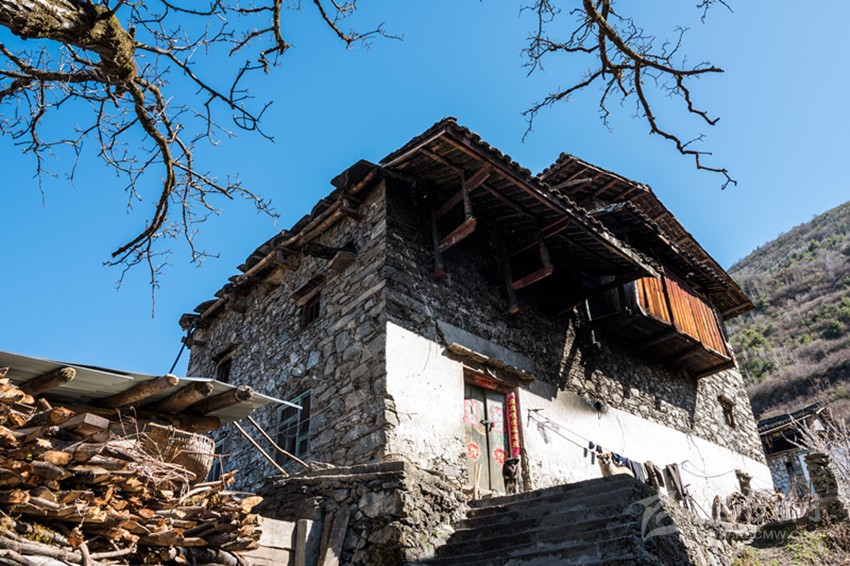 魚通人的房屋符合古人對(duì)居所背山面水的要求,多依山而建。房屋為木石混合結(jié)構(gòu),以片石木材和黃泥為主要材料建成,當(dāng)?shù)厝朔Q之為“碉房”。房屋用石塊壘起,以木頭為墻筋,每隔一定高度,橫砌進(jìn)入石塊,融為一體,使之更為堅(jiān)固牢靠?!暗锓俊?/span> 一般為三層或四層,呈四角或六角形。底層為關(guān)牲畜。第二層為“堂屋”, 在過去,是集做飯、吃飯、烤火、家人日?;顒?dòng)為一體的場所,地上設(shè)有火塘、灶,并在火塘上設(shè)石制三腳鍋莊或鐵三腳。第三層為各居室,有的設(shè)有貯藏室和會(huì)客屋。頂層為經(jīng)堂,室外為曬壩,作打場、曬場用。有些在外側(cè)設(shè)有一小吊腳樓,可堆放雜物。隨著時(shí)間的流逝,古老的碉房已無法滿足現(xiàn)在居民的需求,已很少有人居住,而新式碉房在傳統(tǒng)的基礎(chǔ)上開始出現(xiàn)。