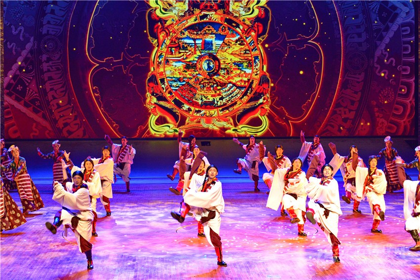 《亞丁?三怙主》歌舞劇不僅從藏族人民日常生產(chǎn)生活中提煉出很多舞蹈文化元素,還對(duì)宗教樂(lè)舞進(jìn)行了合理的借鑒。舞劇中用了道孚嘛呢鍋莊、德格卓且、巴塘弦子、爐霍鍋莊、石渠真達(dá)鍋莊、丹巴鍋莊、稻城鍋莊等民間舞蹈等元素,加以深化再創(chuàng)作,把原有的民間舞蹈的步伐、舞姿進(jìn)行夸張性的舞臺(tái)處理,并配以適當(dāng)?shù)年?duì)形,以更加適應(yīng)劇場(chǎng)舞臺(tái)的表演;大膽創(chuàng)新引入寺廟樂(lè)舞,寺廟樂(lè)舞本是藏傳佛教寺廟在宗教節(jié)日表演的祈福性舞蹈,舞劇編創(chuàng)人員合理借用寺廟樂(lè)舞的音樂(lè)、步伐、面具等,用以表現(xiàn)藏族人民與自然抗?fàn)?,不懼不屈的精神面貌;用泥土筑墻本是藏族人民建造房屋時(shí)的一種建筑技藝,在民間演繹成為地方舞種,舞劇編創(chuàng)人員將筑墻的基本步伐和動(dòng)作加以提煉,編創(chuàng)了一段約兩分鐘的打舞,用夸張的步伐和動(dòng)作,配以鏗鏘有力的勞動(dòng)號(hào)子,將豪氣灑脫的打墻舞氣氛推向高潮,以表達(dá)藏族人民的勤勞、勇敢與豪邁。州委黨校高級(jí)講師陶勇說(shuō):“《亞丁?三怙主》歌舞劇旨在講解香格里拉之魂,詮釋亞丁三怙主的本意,闡釋三座神山文化包含佛陀的核心教義。亞丁三怙主即仙乃日(觀世音菩薩)、央邁勇(文殊菩薩)、夏諾多吉(金剛手菩薩),它們分別象征慈悲、智慧、力量。這部歌舞劇是解讀藏民族精神文化、弘揚(yáng)藏民族真善美勇、傳遞康巴文化真諦的民族歌舞劇。歌舞劇通過(guò)《序》、《慈明》、《慧明》、《力明》、《尾聲》五個(gè)篇章,充分展示藏族傳統(tǒng)文化中熱情、好客、善良、慈悲、勇敢、追求和諧的優(yōu)秀價(jià)值觀,將民族文化融入到社會(huì)主義核心價(jià)值觀,展現(xiàn)了當(dāng)代人民群眾的幸福生活。同時(shí)對(duì)游客來(lái)講不僅豐富了亞丁文化,填補(bǔ)了游人僅僅觀賞雪山不知文化內(nèi)涵的短板,為以后推介甘孜州做了很好的示范?!?/span>