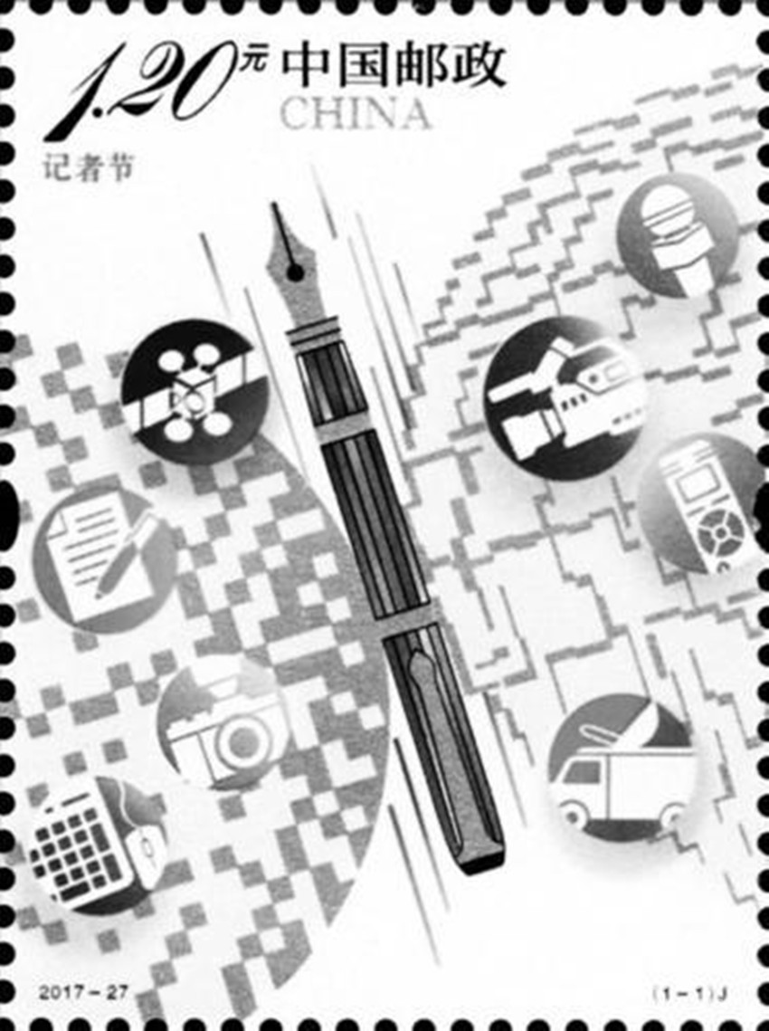 為紀(jì)念第18個記者節(jié)。中國郵政定于2017年11月8日發(fā)行《記者節(jié)》紀(jì)念郵票一套1枚。郵票圖案采用了具有現(xiàn)代感的構(gòu)成手法及色彩表達(dá)方式。畫面中的鋼筆象征了記者秉持弘揚(yáng)民族精神、維護(hù)國家利益和社會責(zé)任的專業(yè)精神和自信風(fēng)范。兩側(cè)的線條及方點(diǎn)構(gòu)成的兩個圓形圖案分別隱喻地球和現(xiàn)代網(wǎng)絡(luò)體系,表示在新媒體時代,新聞傳播媒介所呈現(xiàn)出的多元化、全球化的發(fā)展態(tài)勢。畫面中麥克風(fēng)、攝像機(jī)、錄音筆等形式各異的采編設(shè)備圖標(biāo),結(jié)合衛(wèi)星及地面發(fā)射站等元素,突出了當(dāng)代記者巨大的社會影響力。同時,鋼筆和兩側(cè)的圓形圖案共同組成了一只振翅飛翔的蝴蝶形象,喻意了記者追求至善至美,在探訪報道中擔(dān)負(fù)著傳播先進(jìn)文化,引領(lǐng)和維護(hù)和諧社會,推動人類文明的崇高使命和社會責(zé)任。