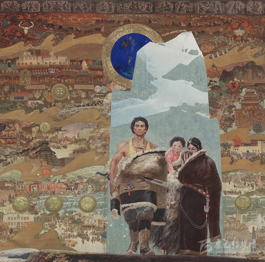 青藏高原有著曠遠(yuǎn)弘大的人文地理,有著神秘久遠(yuǎn)的宗教文化傳承,正是這蒼茫大地孕育了藏族人;正是這片極度追求審美體驗(yàn)并把生活高度藝術(shù)化的疆域,滋養(yǎng)了西藏藝術(shù)。從早期的巖畫(huà)、旗幡畫(huà)、唐卡、壁畫(huà),再到當(dāng)代的丹青重彩,無(wú)不生發(fā)于這片神奇高原,皆是中華民族文化寶庫(kù)中燦爛的牟尼寶珠。唐卡繪畫(huà)肇啟于松贊干布隆興之時(shí),向南學(xué)習(xí)印度、尼泊爾布畫(huà),往西受到犍陀羅藝術(shù)浸潤(rùn),向東融合唐、宋、明、清之審美,再集藏地宗教文化、民族審美熔為一爐,鑄就一千三百年唐卡繪畫(huà)之法脈。它不僅是獨(dú)具魅力的藏文化之血脈源流,更是各民族文化交融、和諧互生的典范,對(duì)世界藝術(shù)有著深遠(yuǎn)的影響。