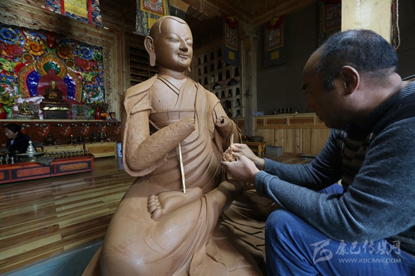 見到克村時,他正在鄰村一農(nóng)戶的經(jīng)堂里制作佛像,盤坐在蓮花寶座上的宗喀巴大師和兩個弟子身披袈裟手持經(jīng)書的泥塑作品神形兼?zhèn)?,這是克村和徒弟多登近半個月的心血。克村坐在布墊上,心無旁騖神情專注地,用木制工具對作品進行打磨,旁邊擺放著一盆清水和一筐自制的工具。
