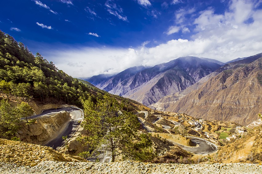如今,所有鄉(xiāng)村通了硬化路,橫跨在金沙江上的十余座跨江大橋氣貫如虹,天塹變通途。過去我們下鄉(xiāng)時(shí),從日雨到曲雅貢,只有一條從因都?jí)伪澈蟮陌肷窖?。蒼茫大山,路上幾乎看不見一顆大樹,也找不到一滴水源。從山腰看江畔的因都?jí)危挥袃蓱羧思?,幾株綠樹總令焦渴難耐的我們望“綠”興嘆!下山走到金沙江邊,熾烈陽光從河灘上反射,火辣辣照在臉龐和皮膚,熱浪令人窒息,感覺目的地遙不可及?,F(xiàn)今,干部下村完全不需要走路,走路下鄉(xiāng)對(duì)年輕人來說簡(jiǎn)直不可思議。公路像一條飄帶環(huán)繞山間,使散落在峽谷中的村寨愈發(fā)展現(xiàn)出欣欣向榮的新風(fēng)貌。