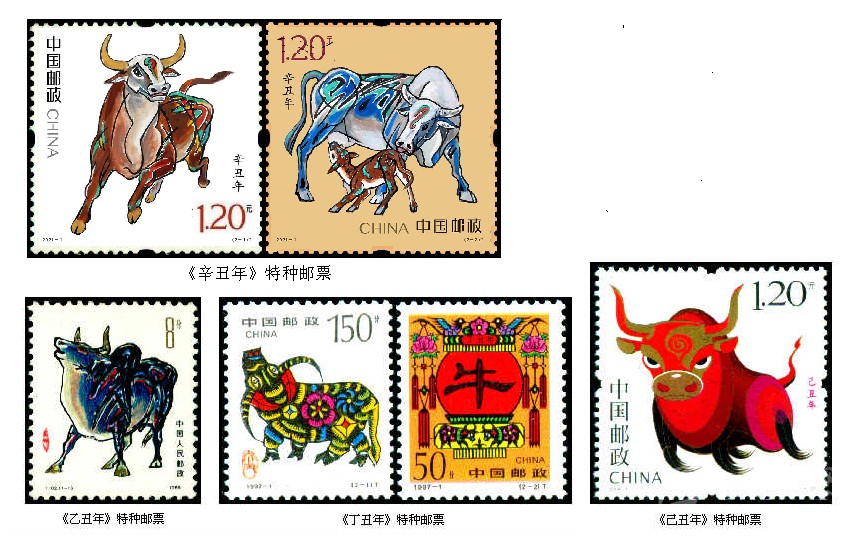 1997年1月5日發(fā)行第二輪生肖郵票中的“牛票”,即《丁丑年》特種郵票,全套2枚。由郵票設(shè)計(jì)師呼振源設(shè)計(jì)。第一枚“金牛奮蹄”,畫面依據(jù)山東省高密縣方市鄉(xiāng)前曹戈莊村當(dāng)時(shí)33歲的農(nóng)村女子齊秀花的剪紙作品《媳婦騎牛圖》進(jìn)行設(shè)計(jì),原作中的“媳婦”被刪去,突出了牛的形象,體現(xiàn)出膠東地區(qū)民間剪紙藝術(shù)源于生活、構(gòu)思巧妙、粗獷中多見細(xì)膩的本色。只見那彎彎的牛角,垂地的長尾,壯實(shí)的牛身,穩(wěn)健的四蹄,都真實(shí)地再現(xiàn)了生活中牛的特點(diǎn),牛身上似花非花,似銅錢又非銅錢的紋飾,充分地表現(xiàn)出樸實(shí)的浪漫主義。第二枚“牛耕年豐”,畫面主圖為一只高高掛起的大紅燈籠上,映出了一個(gè)醒目的隸書“?!弊?,為牛年的慶春象征。圍繞著這只燈籠,又進(jìn)行了幾多創(chuàng)意,兩只喜鵲和一朵梅花,喻意“喜鵲登梅”;旒蘇上的兩朵牡丹,代表幸福、富貴;特別是那春意盎然的“雙牛圖”,畫面雖小,確為點(diǎn)睛之筆,與主圖的大“牛”字緊密呼應(yīng)。