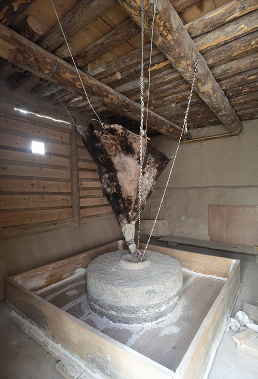 一條約三米寬的水渠橫穿眼前,水渠在側面依次開了七個口子。上游三個用來排水,冬天用隔板擋著,夏天則用來泄水。中游三個口子都是磨坊的動力來源。走進去是一處水磨坊,三座半徑約0.8米的石磨間隔1.7米一字排開。頂端是牛皮制成的青稞喂料器,由四根繩子系在房間頂角的不同方向;尾端是由牛角制作的喂料嘴,略顯復雜的繩拉式調節(jié)器錯綜復雜,但卻精妙無比地控制著青稞的出料速度。