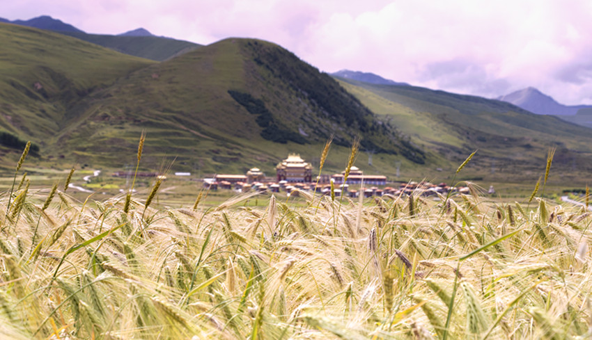 甘孜縣地處橫斷山脈的東北邊緣,康北地區(qū)腹心地帶,雅礱江從這里緩緩流過,肥沃的土壤和無垠的土地總會配上澄徹晴朗的天空。一顆顆飽滿金黃的青稞常在風里搖晃著秋天,“康北糧倉”的美在這時展現得淋漓盡致。