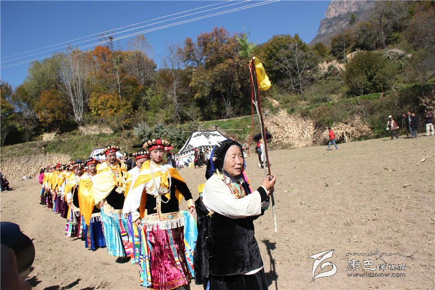 所有的祈福儀式結(jié)束后,村子里一位德高望重的長輩走上圓臺,用雄渾有力的嗓音向場地外等候的人們發(fā)出指令。在一段念詞結(jié)束之后,參加成人儀式女孩們的父親們在一位老人的指引下緩緩的向場地中央走來,老人手舉一幅一米高的唐卡畫,口中念念有詞,走在他后面的父親們一襲白色的毪衫,頭戴一頂灰色的禮帽,腳穿紅黑相間的藏靴,頸上掛著一根潔白的哈達,滿臉肅然的緊隨老人之后,來到月形的臺子邊,站成一個半圓形。當父親隊站定后,母親隊們也向場地中移步而來,本次成人儀式的主角們在一位老阿媽的帶領下向場地中走來,每一位女孩穿著打扮都是那么的光鮮靚麗,每一個人都顯得美麗動人,她們披著黃色的披風,一根白色的哈達在胸前打著結(jié),五顏六色的哈達懸掛在這根哈達上,在姑娘們的后背迎風飄飛。走到圓臺邊,小女孩們也圍成半圓,低著頭,等待著喇嘛們的念經(jīng)祈福和家人的祈福。此時,兩位吉祥老人站了起來,手中拿著凈瓶,走到姑娘們面前,一邊念誦經(jīng)文,一邊將手中凈瓶里的水倒在姑娘們的手心里,姑娘們則虔誠的將這圣水輕輕的抹在自己的額頭上,寓意吉祥如意。待喇嘛主持儀式結(jié)束后,主持儀式的老人用嘉絨語向蒼天和墨爾多神山祈禱,希望神賜予孩子們美麗的面容和美好的心靈,從今日起,她們就可以真正的長大成人了。吉祥詞念誦完后,母親們排著長長的隊伍緩緩來到孩子們的面前,將懸掛在胸前的哈達取下,久久的凝視著女兒的臉,眼角掛著幸福的淚水,用顫抖的聲音為女兒祈福,叮囑孩子們要孝敬父母,做一個正直善良的人,然后,才將白色的哈達掛在女兒的頸上,父親們則站在原地,看著母親們將哈達和祝福送給女兒,見證著女兒們的長大成人。接受完父母和長輩們的祝福之后,盛大的鍋莊舞會開始了。小女孩們也跟隨著這些舞者們手牽著手走到場地中央,跳起歡快的鍋莊舞。擁忠大娘說,成年禮上的鍋莊舞會一般都要視參加成人禮儀式女孩們親戚多寡而定,每一名長輩都會走到場地中牽頭,跳起舞蹈,這時候是女孩的長輩們炫耀舞技和歌聲的時候,他們矯健的舞步和甜美的歌喉迎來眾人的和鳴。