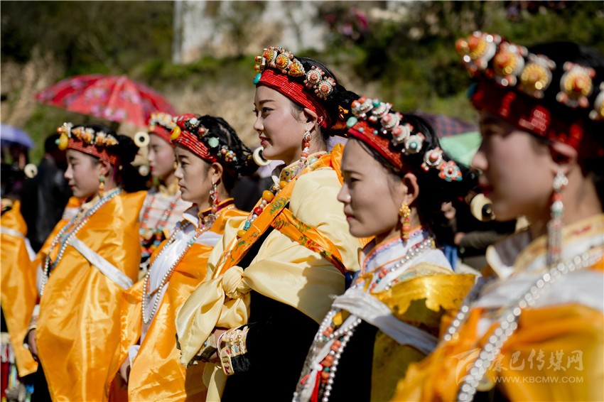 盤好發(fā)髻,佩戴好頭飾,在肩、背系好五彩哈達(dá)后,由本村具有威望的女性長者引領(lǐng)來到儀式現(xiàn)場。法號聲中,煨桑的青煙裊裊升起,威嚴(yán)的活佛主持誦經(jīng)祈福儀式。隨后,德高望重的長者為參加儀式的女子送祝福茶,長輩為姑娘們獻(xiàn)哈達(dá)。一系列儀式結(jié)束后,無論男女老少,都來到場地中央,踏歌起舞,跳起吉祥的鍋莊。