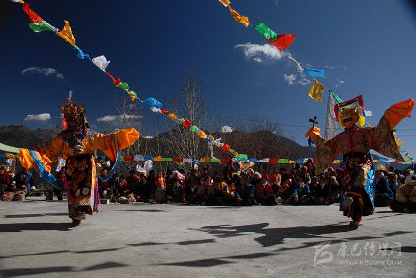 康巴藏傳佛教各派每年冬春都要舉行面具不同、內(nèi)容各異的跳神祭祀活動(dòng),規(guī)模最大的數(shù)德格縣更慶寺的普巴多吉——《金剛撅童子》跳神。這一活動(dòng)于藏歷每年元月中旬舉行,由僧人演出,連續(xù)兩天,是歷時(shí)十天的佛事活動(dòng)的組成部分。屆時(shí)群眾從四面八方絡(luò)繹而至,上萬人匯聚于大壩爭相觀看,場(chǎng)面十分壯觀。