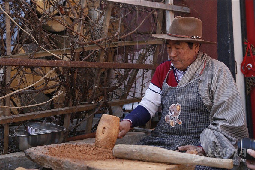 四龍降澤將一塊塊雌雄泥放在平坦的石頭上,用木錘敲打,泥土被打散后,用石頭研磨,再通過木篩濾出最細的泥土備用,接著把以紅景天為主的60多種中草藥、香果為主的20多種香藥和60多種藏藥以及珊瑚、綠松石、瑪瑙等組成的80多種寶石和80多種宗教圣物稱量,按照一定的比例與泥土混合,繼續(xù)將藥物與泥土搗碎、研磨直至混為一體,然后把取自海拔4600米以上無污染的水將泥土、藥物和在一起,然后用類似搟面杖的木棒捶打并揉成面團,放入地窖發(fā)酵7天直至香味溢出。