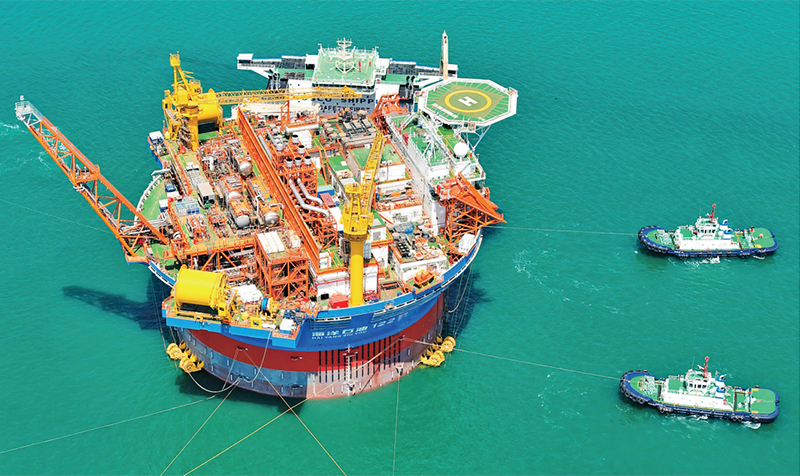 “??惶枴保莵喼奘姿覉A筒型浮式生產(chǎn)儲卸油裝置。該裝置集原油生產(chǎn)、存儲、外輸?shù)裙δ苡谝惑w,被網(wǎng)友們昵稱為“超級能源碗”,也是完全由我國自主設(shè)計(jì)建造的海上油氣加工廠。圖為2024年5月12日,“??惶枴睆闹袊S颓鄭u國際化高端裝備制造基地離港啟運(yùn)。 人民圖片 張進(jìn)剛/攝