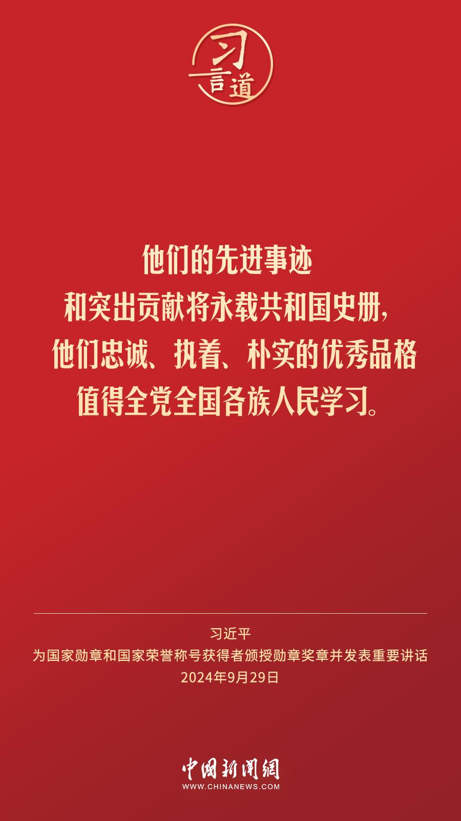 經(jīng)中共中央批準,中華人民共和國國家勛章和國家榮譽稱號頒授儀式于9月29日上午10時在人民大會堂隆重舉行。中共中央總書記、國家主席、中央軍委主席習(xí)近平向國家勛章和國家榮譽稱號獲得者分別授予“共和國勛章”“友誼勛章”和國家榮譽稱號獎?wù)虏l(fā)表重要講話。習(xí)近平指出——