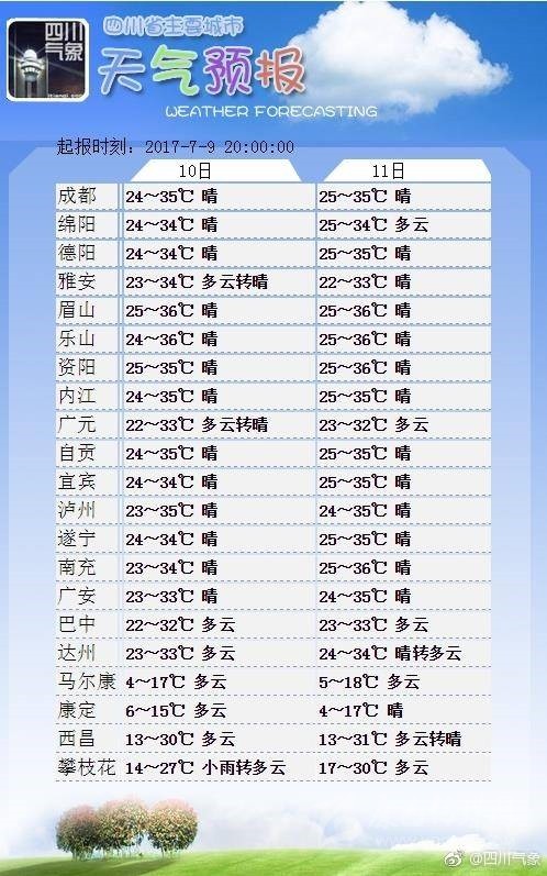 11日晚上到12日白天:盆地各市多云,廣元、巴中、雅安3市及綿陽、德陽、成都、眉山、樂山5市西部有陣雨或雷雨;川西高原和攀西地區(qū)晴轉多云,大部分地方有陣雨或雷雨。