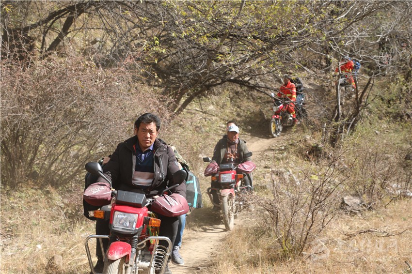 11月4日,澤仁頓珠在中轉(zhuǎn)站接到第一個任務(wù)——送一名搶險隊員和約50公斤的物資到堰塞體上。從則巴村出發(fā)鉆進(jìn)灌木叢中,他才感受到路途艱難。所謂的道路是之前的人和摩托車踩出來的“騾馬道”,最窄的地方僅約30厘米。張牙舞爪的灌木枝不時從臉上、手臂上劃過,路兩邊不是陡坡,就是十幾米高的懸崖。