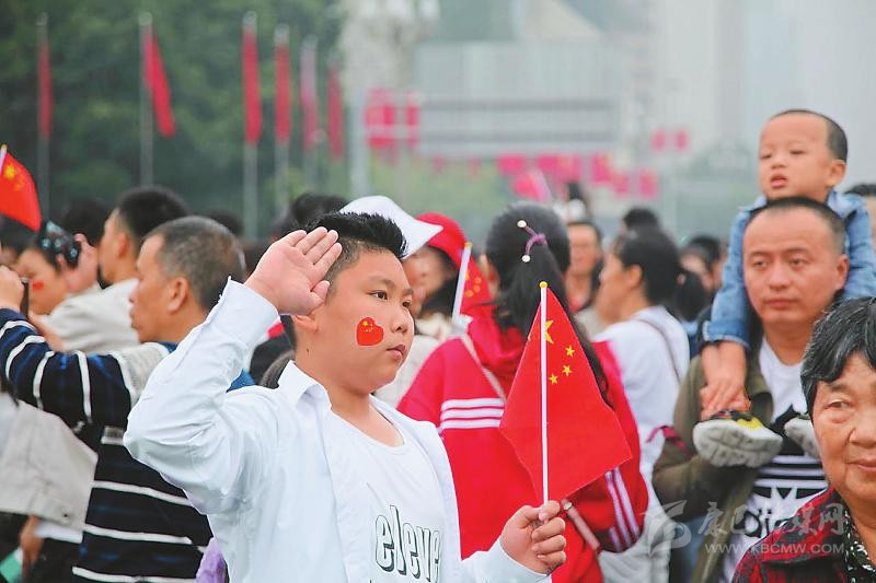 在廣元,雖然天空飄著小雨,但上百名黨員干部和市民自發(fā)聚集在市政府廣場。雄壯的國歌聲中,目送五星紅旗冉冉升起后,現場爆發(fā)出熱烈的歡呼聲。升旗儀式結束后,廣元市委組織部年輕干部趙志浩請同事為自己和父親拍了3張合影。作為當地引進的人才,他第一次在廣元參加國慶升旗活動,“見證共和國70華誕,也激勵我為廣元發(fā)展貢獻力量。”