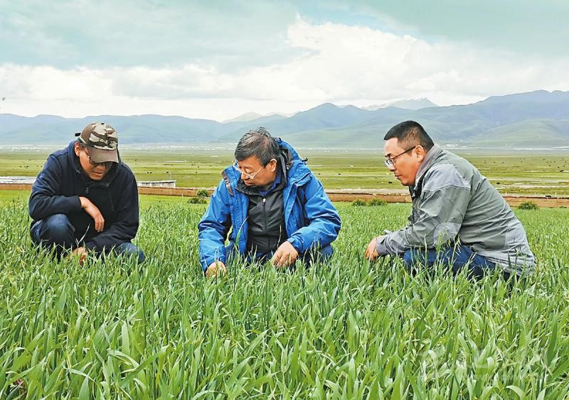 周青平(中)和同事在高原上研究草種。