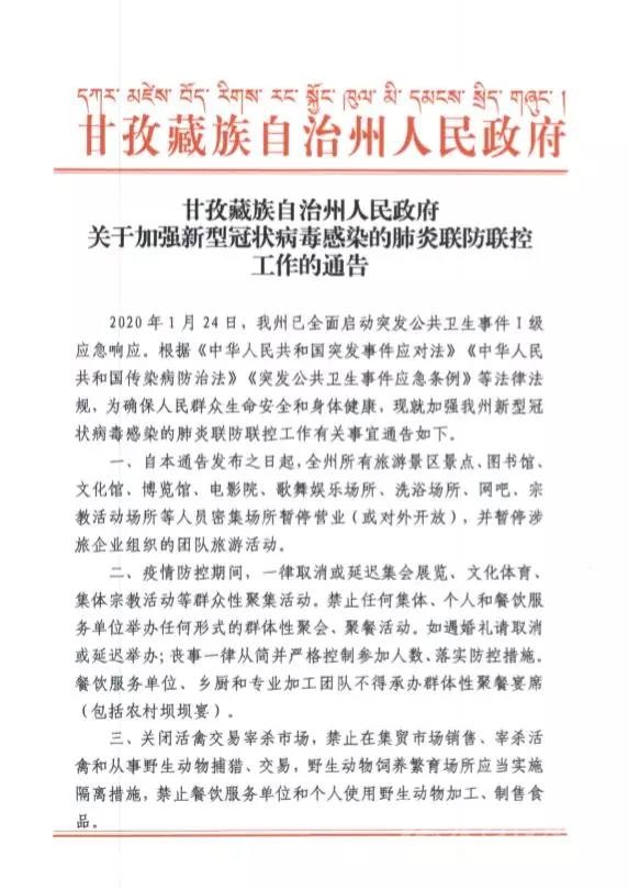 2020年1月24日,我州已全面啟動突發(fā)公共衛(wèi)生事件I級應(yīng)急響應(yīng)。根據(jù)《中華人民共和國突發(fā)事件應(yīng)對法》《中華人民共和國傳染病防治法》《突發(fā)公共衛(wèi)生事件應(yīng)急條例》等法律法規(guī),為確保人民群眾生命安全和身體健康,現(xiàn)就加強我州新型冠狀病毒感染的肺炎聯(lián)防聯(lián)控工作有關(guān)事宜通告如下。一、自本通告發(fā)布之日起,全州所有旅游景區(qū)景點、圖書館、文化館、博覽館、電影院、歌舞娛樂場所、洗浴場所、網(wǎng)吧、宗教活動場所等人員密集場所暫停營業(yè)(或?qū)ν忾_放),并暫停涉旅企業(yè)組織的團隊旅游活動。二、疫情防控期間,一律取消或延遲集會展覽、文化體育、集體宗教活動等群眾性聚集活動。禁止任何集體、個人和餐飲服務(wù)單位舉辦任何形式的群體性聚會、聚餐活動。如遇婚禮請取消或延遲舉辦;喪事一律從簡并嚴(yán)格控制參加人數(shù)、落實防控措施。餐飲服務(wù)單位、鄉(xiāng)廚和專業(yè)加工團隊不得承辦群體性聚餐宴席(包括農(nóng)村壩壩宴)。三、關(guān)閉活禽交易宰殺市場,禁止在集貿(mào)市場銷售、宰殺活禽和從事野生動物捕獵、交易,野生動物飼養(yǎng)繁育場所應(yīng)當(dāng)實施隔離措施,禁止餐飲服務(wù)單位和個人使用野生動物加工、制售食品。四、嚴(yán)格執(zhí)行政府依法制定的價格干預(yù)措施和緊急措施,對假冒偽劣、惡意搶購、囤積居奇、哄抬物價等不法行為依法從嚴(yán)查處。五、廣大社會公眾要提高警惕,支持并參與愛國衛(wèi)生運動,做好個人防護,搞好居家消毒,減少外出和走親訪友,主動報告涉及疫情傳播隱患的一切線索。1月10日以后,有過湖北等疫區(qū)旅居史的,請即刻報告所在地村委會(社區(qū))登記備案,自返鄉(xiāng)(進州)之日起居家隔離觀察14天,并進行早晚體溫監(jiān)測記錄和核驗;一旦出現(xiàn)發(fā)熱、乏力、呼吸困難、呼吸道感染(干咳為主)等癥狀,請立即佩戴口罩就近到當(dāng)?shù)蒯t(yī)療機構(gòu)發(fā)熱門診就診。六、州域內(nèi)所有單位和個人,必須接受衛(wèi)生行政主管部門或有關(guān)機構(gòu)的傳染病調(diào)查檢測、采集樣本等預(yù)防措施;病人、疑似病人和傳染病病人密切接觸者應(yīng)當(dāng)積極配合接受隔離治療、醫(yī)學(xué)觀察等控制措施,并如實提供有關(guān)情況。對拒絕配合的,公安機關(guān)將依法協(xié)助強制執(zhí)行;對妨害執(zhí)行公務(wù)的,公安機關(guān)將依法從嚴(yán)從重處理。七、嚴(yán)禁任何單位和個人發(fā)布不實信息,對有造謠、傳謠等違法行為的,公安機關(guān)將依法嚴(yán)厲查處。本通告自發(fā)布之日起施行,終止日期另行通告。