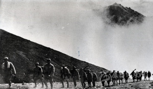 圖為進軍西藏途中的十八軍戰(zhàn)士,背后是高聳入云的山峰。圖片來源:網(wǎng)絡(luò)