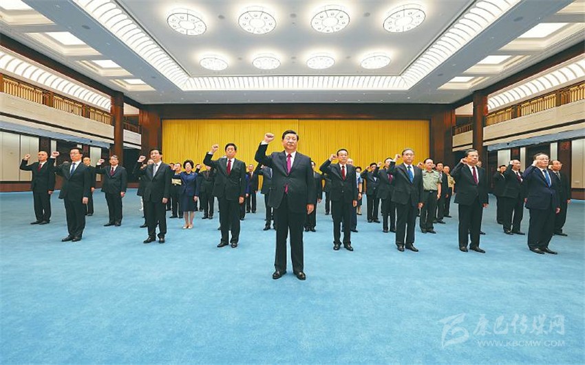 6月18日,黨和國家領導人習近平、李克強、栗戰(zhàn)書、汪洋、王滬寧、趙樂際、韓正、王岐山等在中國共產黨歷史展覽館參觀“‘不忘初心、牢記使命’中國共產黨歷史展覽”。這是參觀結束后,習近平帶領黨員領導同志一起重溫入黨誓詞。 新華社記者 李學仁 攝