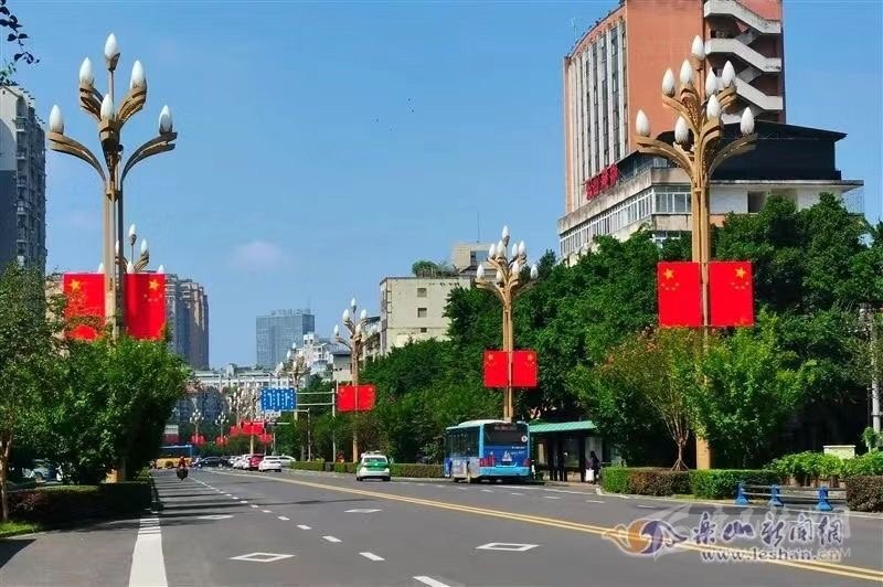 在樂山市,為營造喜慶、熱烈、歡樂、祥和的節(jié)日氛圍,中心城區(qū)嘉定路、柏楊路等多條主干道,以及樂山岷江一橋和二橋共計1217柱燈桿上,懸掛了2000多面國旗,換上“紅裝”后的街道,在藍(lán)天的映襯下顯得格外美麗。