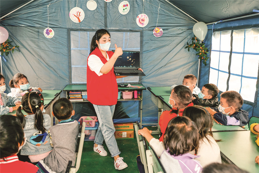 帳篷外,用簡易紙板做成的牌子“青青兒童樂園”特別顯眼,這是首個建在地震震中的兒童樂園?!斑@頂帳篷中充滿了孩子們的歡聲笑語,這在地震災區(qū)就是最動聽的聲音!”青年志愿者毛建美介紹,為了疏導災區(qū)孩子們的情緒、減輕家長們的壓力,相關(guān)部門專門在這里設(shè)置了“青青兒童樂園”,“這里配備5名幼師專業(yè)志愿者和3名大學生志愿者陪護照看,開展學習輔導、健康衛(wèi)生、游戲活動、心靈陪伴、防災減災等五大領(lǐng)域的活動服務?!?/p>