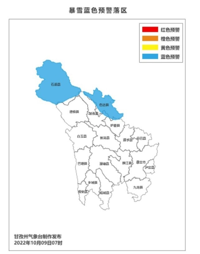 10月9日上午,甘孜州氣象臺發(fā)布了今年第一個暴雪藍(lán)色預(yù)警: