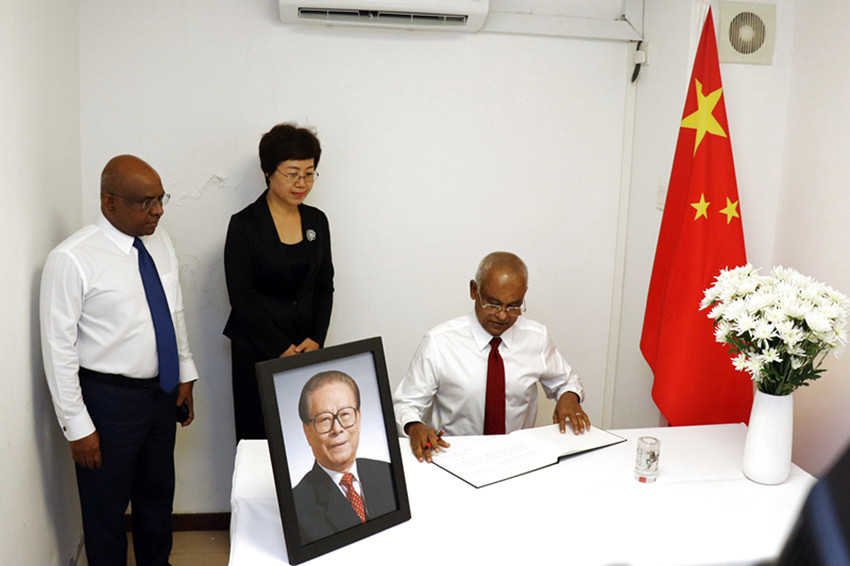 12月5日,馬爾代夫總統(tǒng)薩利赫(右)在中國駐馬爾代夫大使館吊唁江澤民同志。 中國駐馬爾代夫大使館供圖(新華社 發(fā))