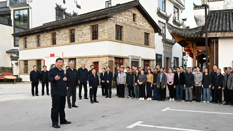 △10月11日,習(xí)近平總書(shū)記在上饒市婺源縣秋口鎮(zhèn)王村石門(mén)自然村考察時(shí),同村民們親切交流。