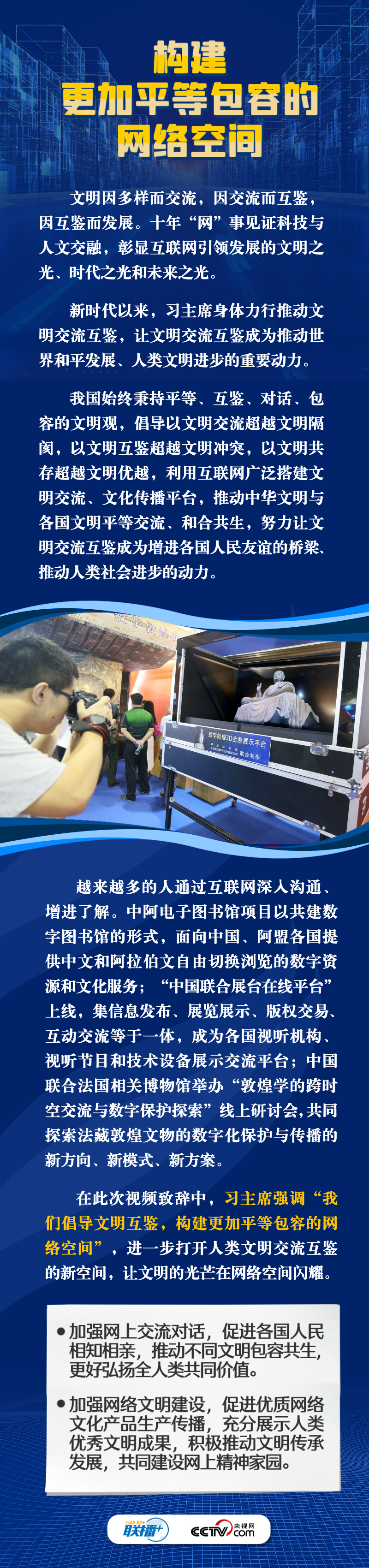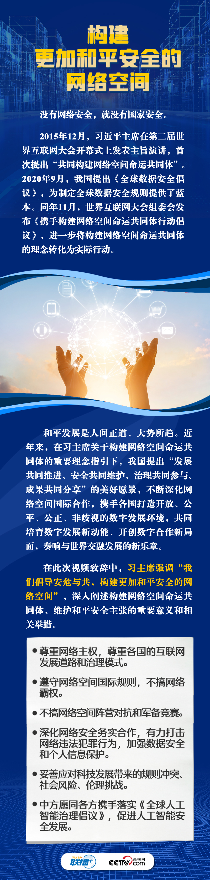 面對新的時代課題,習(xí)主席在此次視頻致辭中倡導(dǎo)構(gòu)建更加普惠繁榮、更加和平安全、更加平等包容的網(wǎng)絡(luò)空間。這三個網(wǎng)絡(luò)空間”具體內(nèi)容是什么?構(gòu)建網(wǎng)絡(luò)“新空間”有什么具體措施?央視網(wǎng)《聯(lián)播+》與您一同學(xué)習(xí)。
